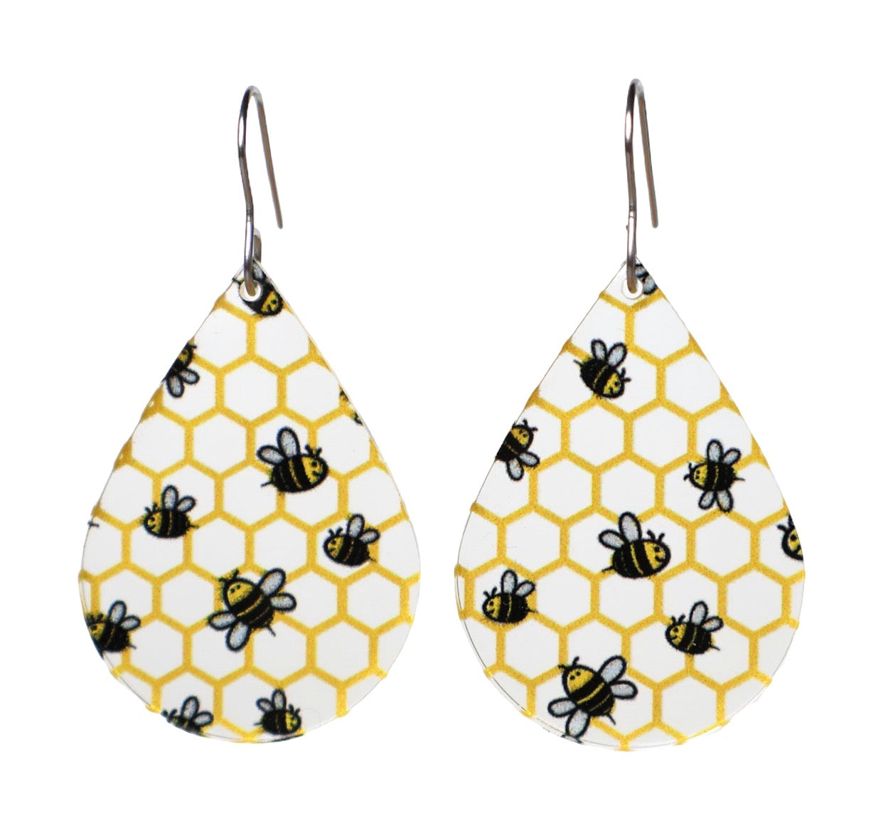 - Bee Honeycomb Pattern Clear Acrylic Teardrop-shaped Dangle Earrings with Stainless Steel Earring Wires.