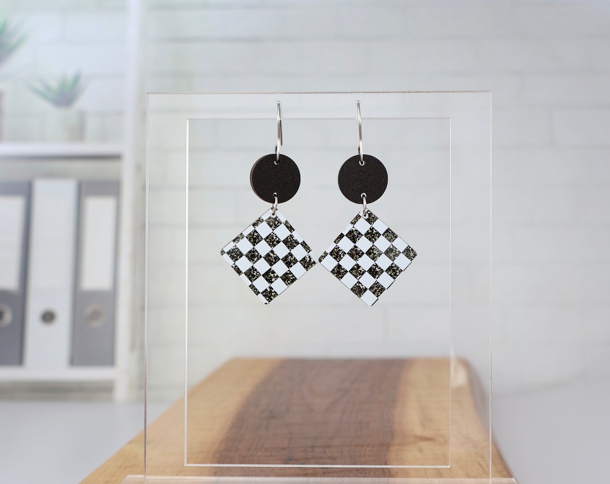 - Stylish Racing Design: Handmade with Glitter acrylic and wood earrings feature a classic black and white checkered pattern for a fun race day look.