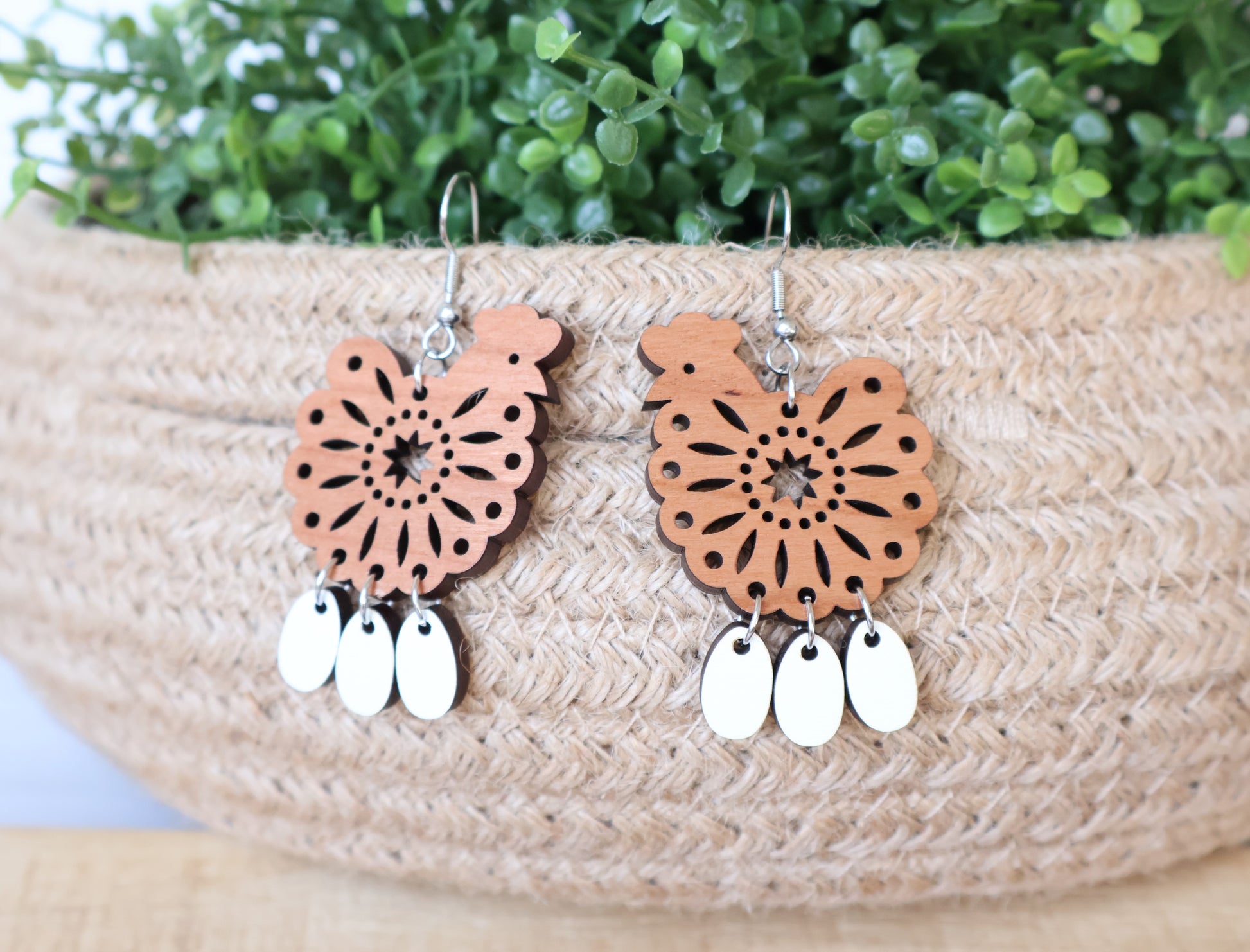 These handmade wooden chicken with egg dangle earrings are the perfect accessory for any chicken lover or nature enthusiast. The earrings are made from high-quality Cherry wood Veneer and have a durable smooth finish. The earrings are lightweight and comfortable to wear all day long. Whether you're looking for a unique gift for a friend or a little something to add some personality to your own outfit, these wooden chicken earrings are sure to impress.