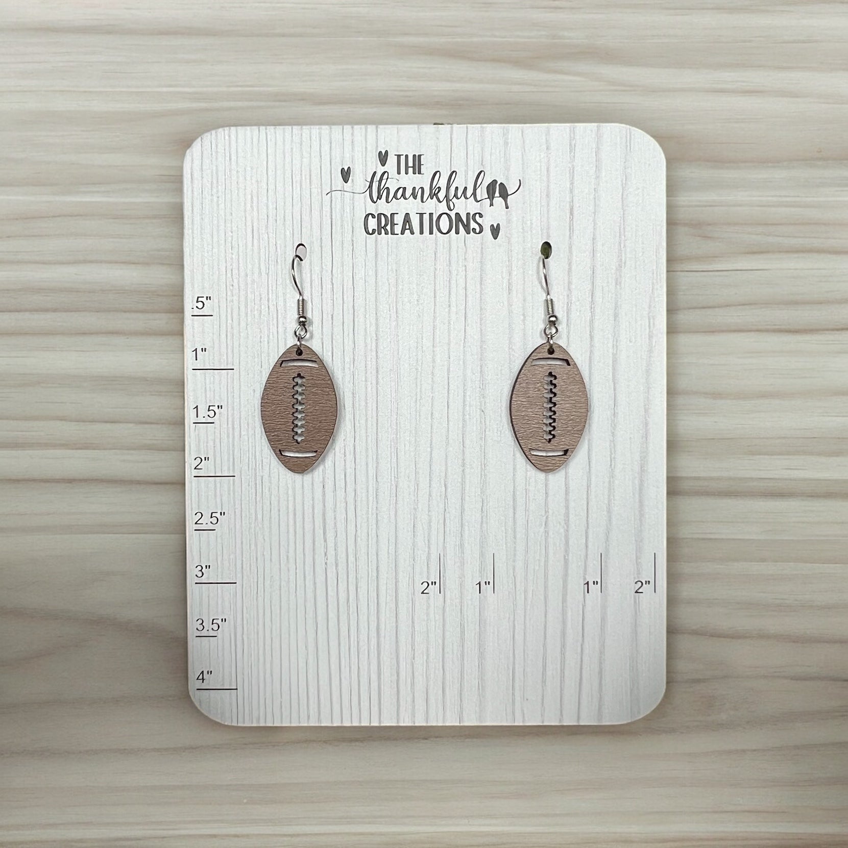 - Handcrafted Football Earrings: Meticulously handmade in Indiana, these earrings feature a football design crafted from high-quality wood with a permanent print of faux walnut on wood.