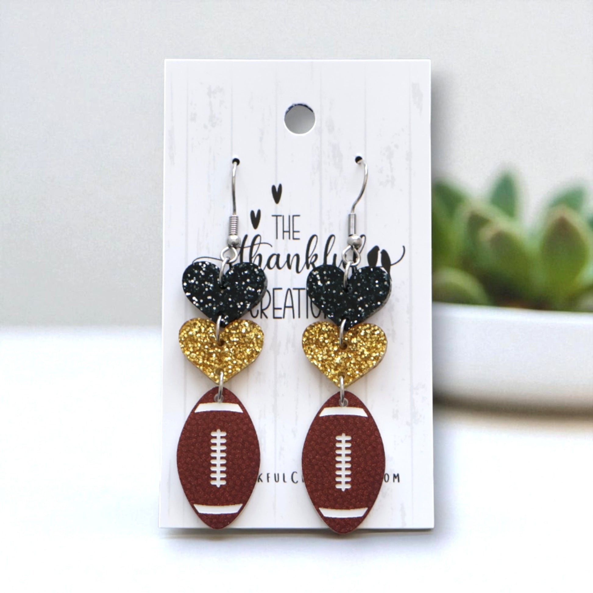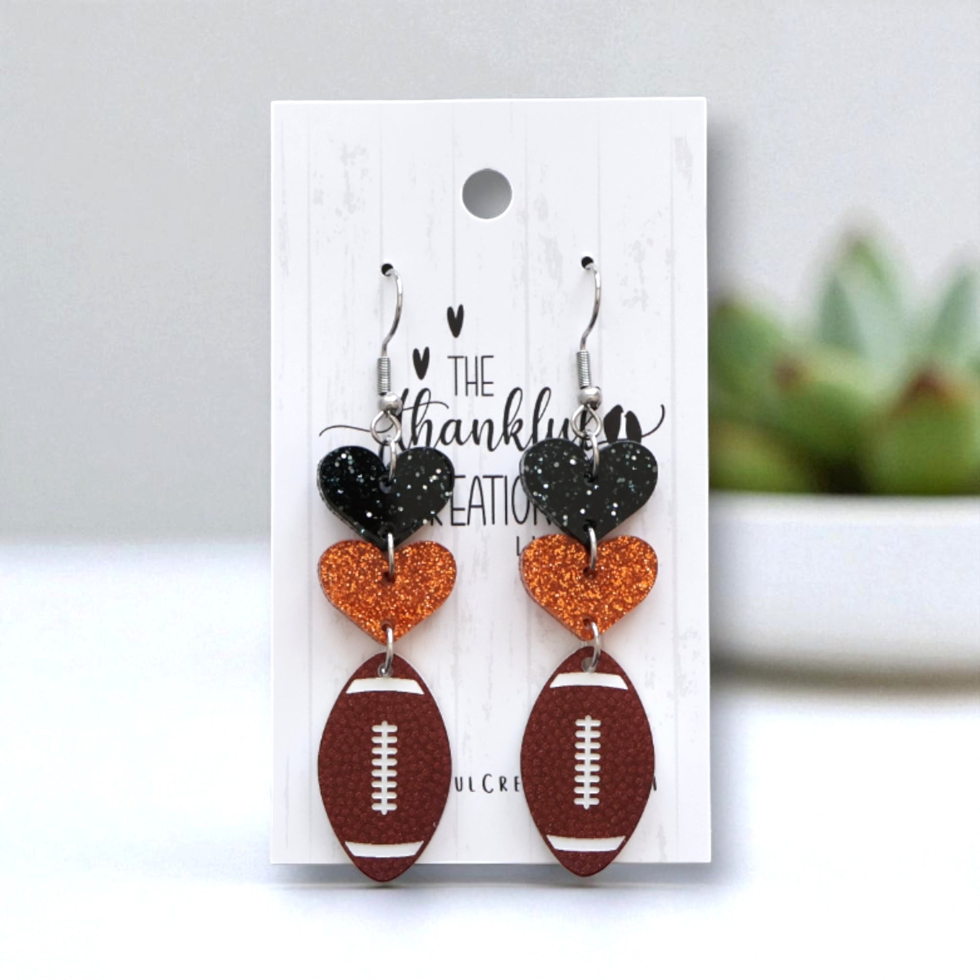 • Team Spirit Ready – Black and orange glitter acrylic hearts with a brown and white football