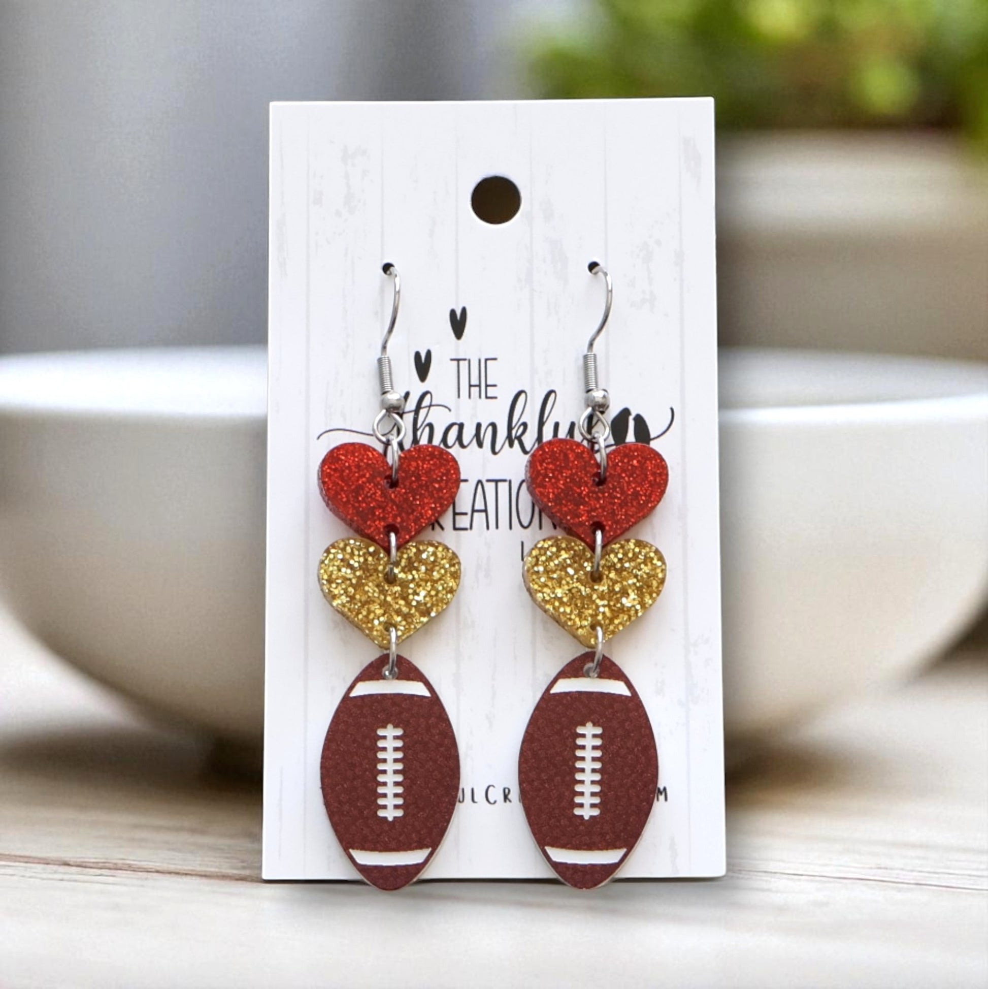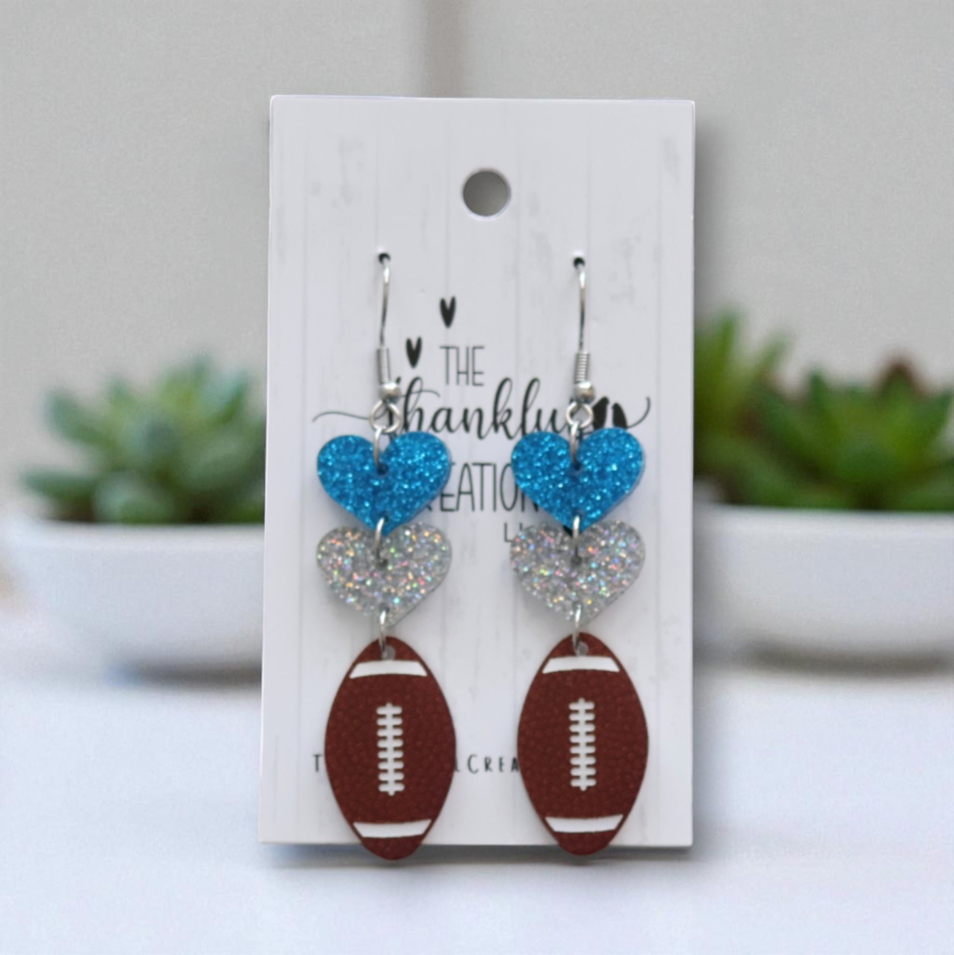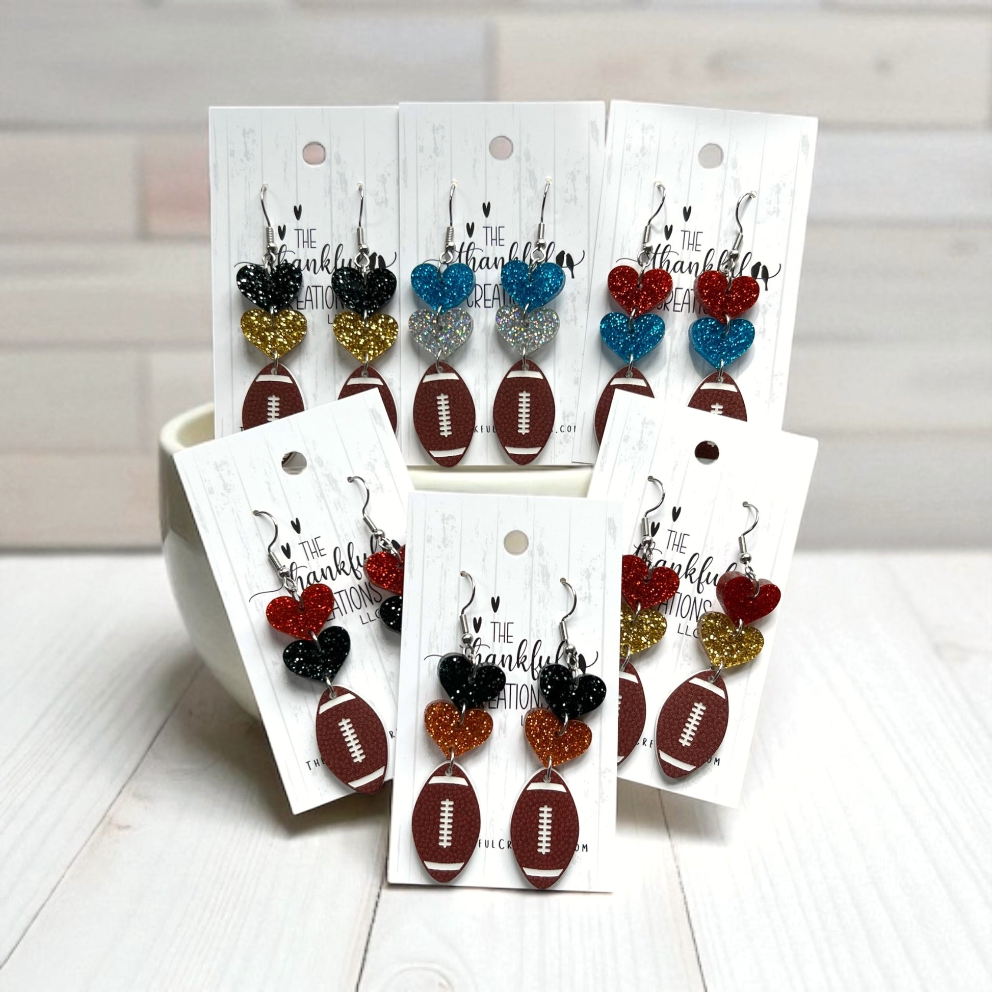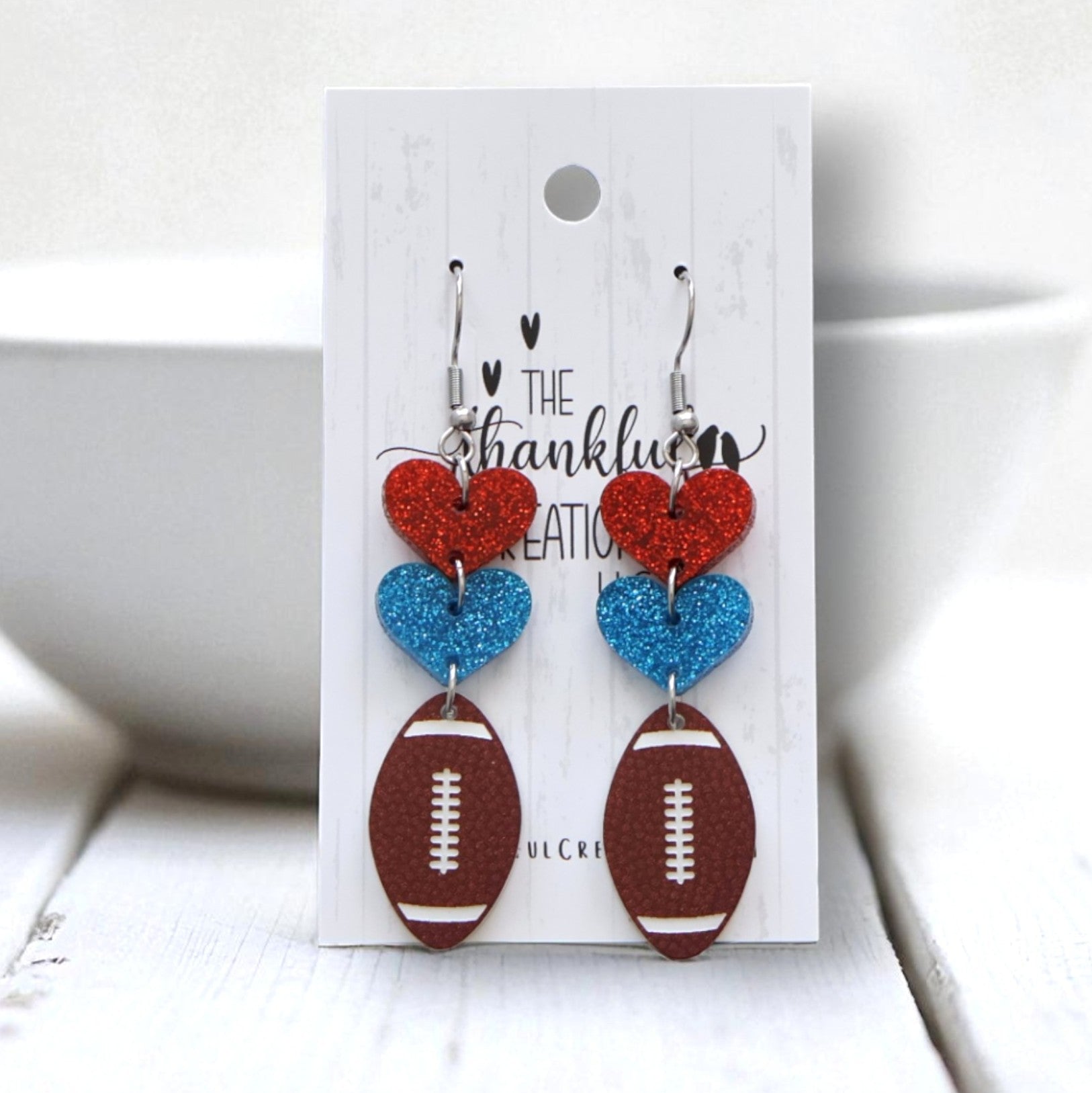 Featuring your choice of color of glitter hearts with a brown and white football, each pair of earrings are carefully handcrafted and designed to turn heads. The lightweight construction and stainless steel ear wires ensure all-day comfort, while the rubber backers keep them secure no matter where the day takes you.