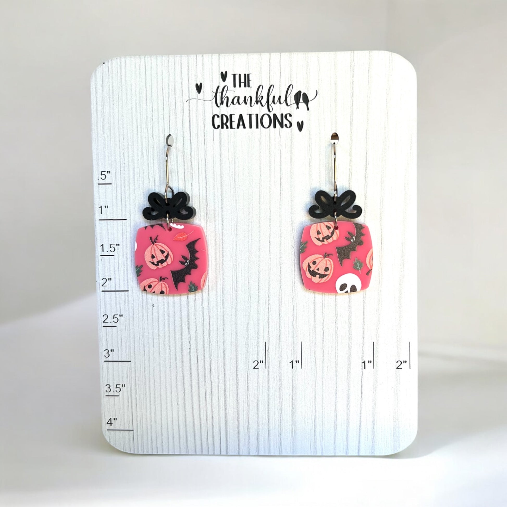 - STYLISH: Black bats and Skulls, Jack O Lantern Pumpkins, Bats and fall leaves scattered on Pink acrylic. Due to the nature of the print, no two pair will be the same. The print is on the front and back of the earrings, so they look great from any angle!