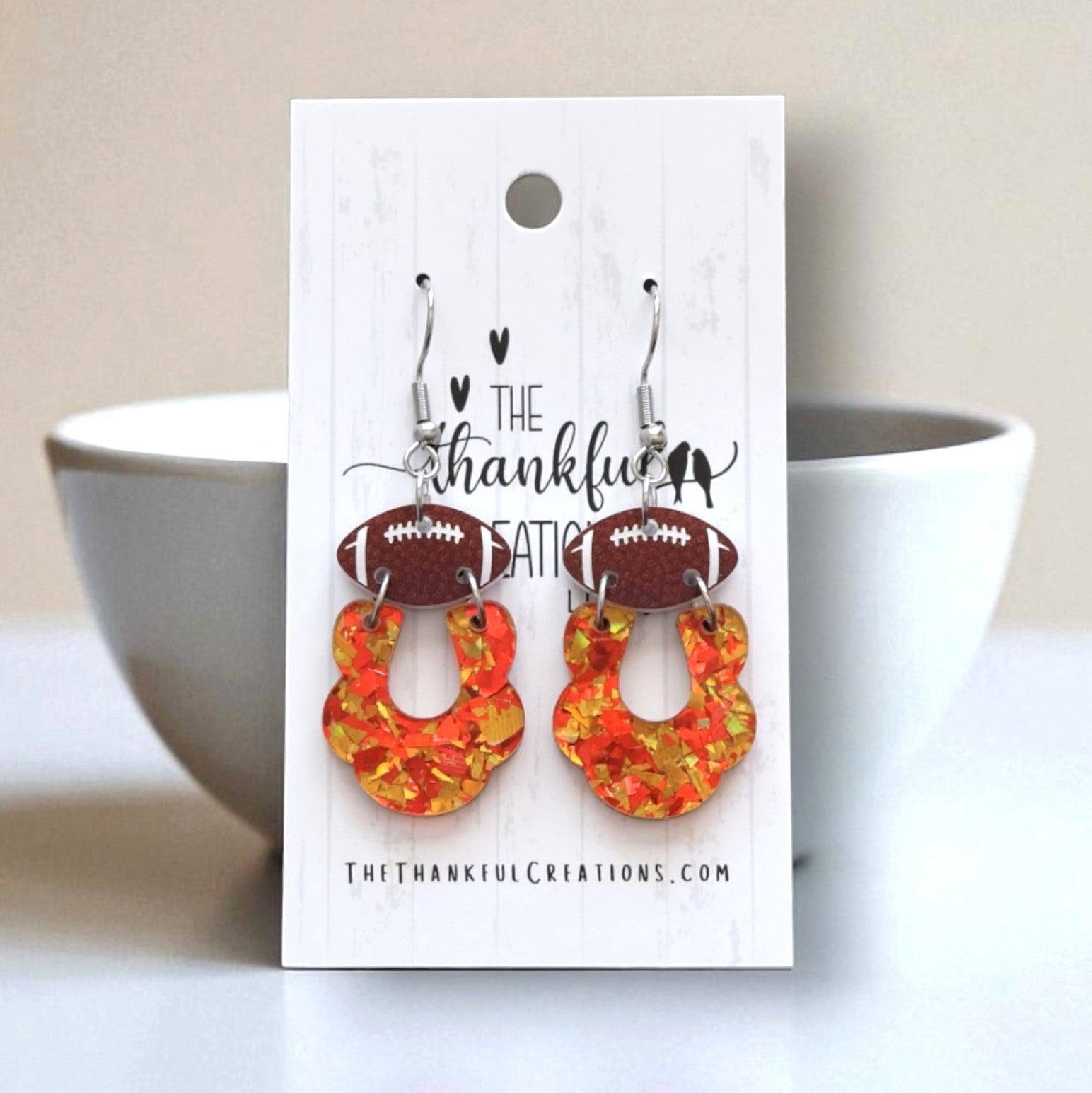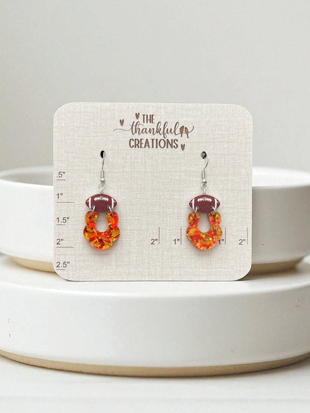 Featuring Red and Gold colored glitter acrylic and paired with a football accent, these lightweight statement pieces are perfect for Game Day, back to school spirit events, and team-themed gifts. They’re an easy, eye-catching way to show your team spirit and love for football all season long.