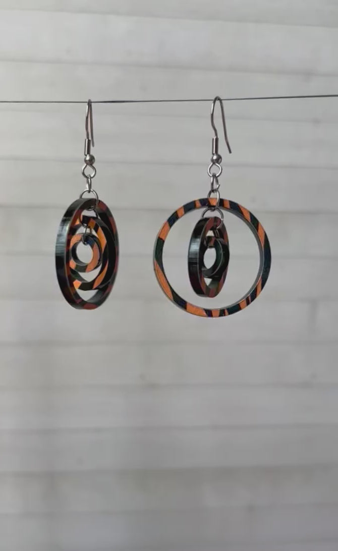 These earrings are so unique and fun! Made of high quality acrylic with Stainless Steel hardware. Approximate size of largest ring (not including hardware) is 1.7" for the large pair, or 1.2" for the small size. Handmade by us.