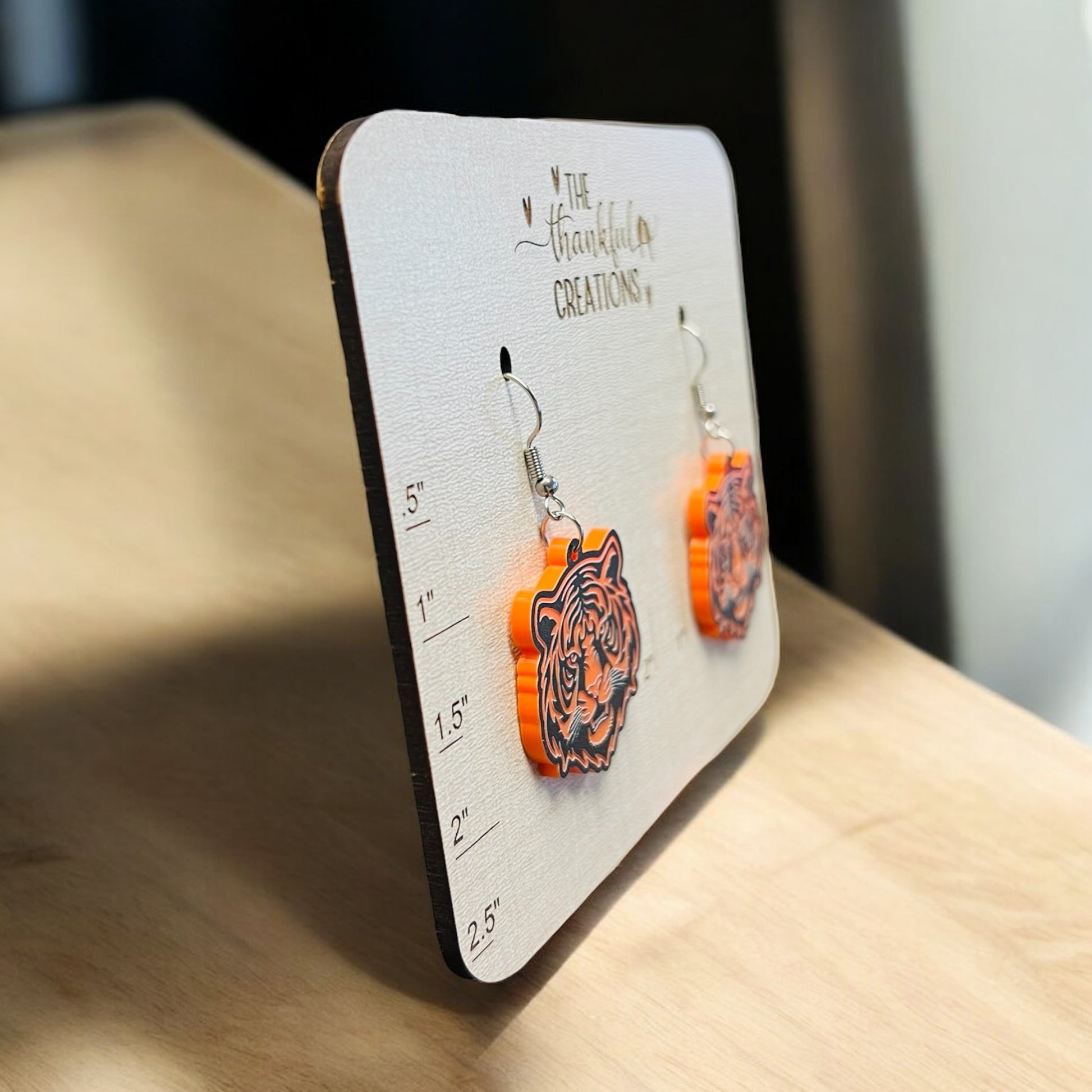 - CRAFTED BY HAND: Each pair is lovingly handmade in Indiana using high quality materials. Engraved tiger details on Orange acrylic. The backside of the earring is orange.
