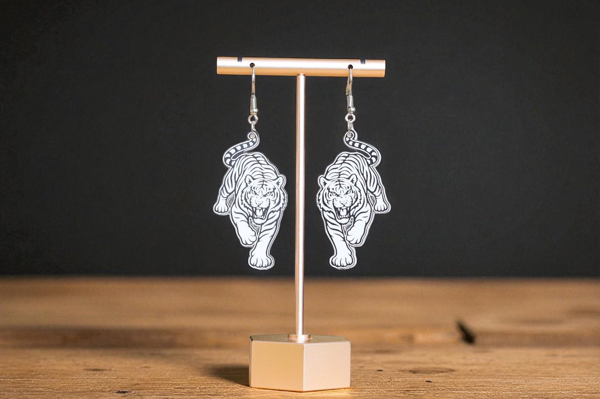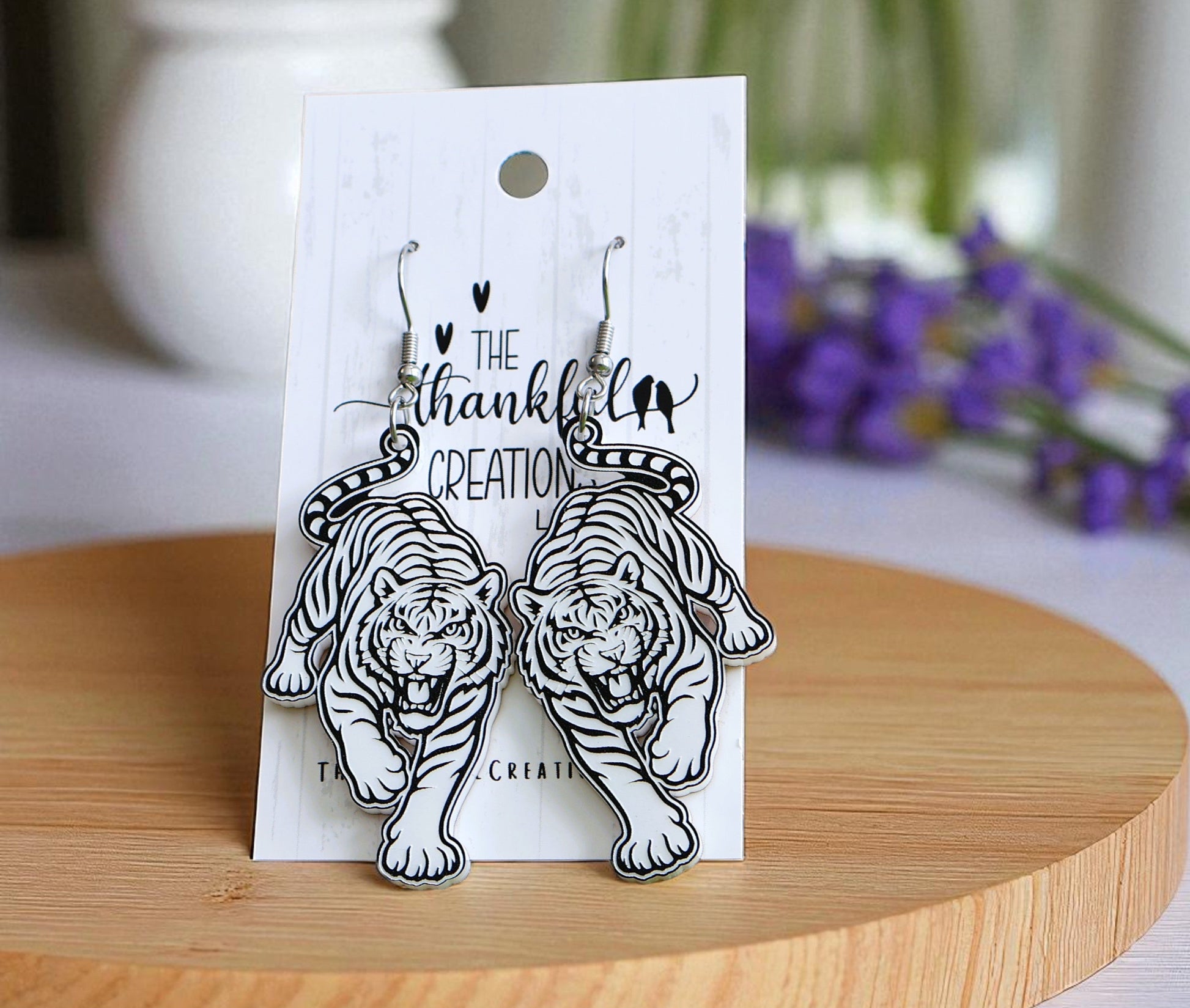 These beautiful white Bengal Tiger earrings make a statement without saying a word. Handcrafted in Indiana using high quality printed acrylic, they dangle effortlessly from stainless steel hardware. Whether you're a sports enthusiast or simply love making a statement, these tiger earrings are the perfect accessory to elevate your style. Measuring approximately 2.6 inches in length, they're the ideal size to command attention without being overwhelming. Embrace your wild side and add a touch of fierceness to your look with these unique and captivating earrings.